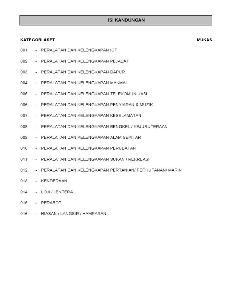 Katalog Kod Aset Peralatan Kelengkapan Dapur Spa